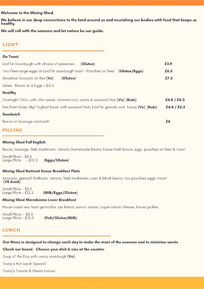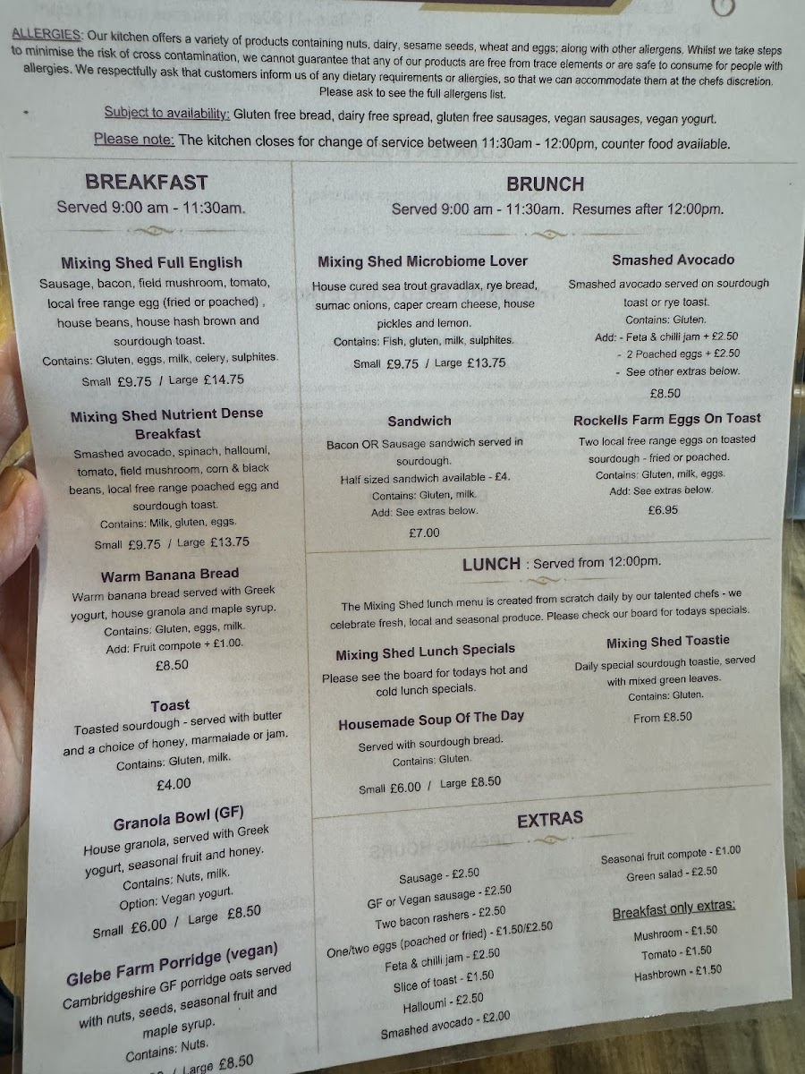 Start your day with their Mixing Shed Full English or the nutrient-rich Mixing Shed Nutrient Dense Breakfast, both priced at £9.75, ensuring you are fuelled for the day ahead. For a lighter touch, indulge in the Granola Bowl for £6.00 or a slice of Warm Banana Bread at £8.50.
